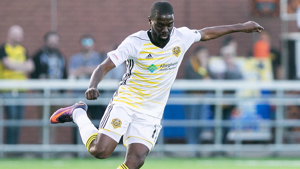 Kenardo Forbes scored the only goal as Pittsburgh Riverhounds SC defeated Indy Eleven in the Third Round of the 2019 Lamar Hunt U.S. Open Cup on Wednesday night. | Photo courtesy Chris Cowger / Pittsburgh Riverhounds SC