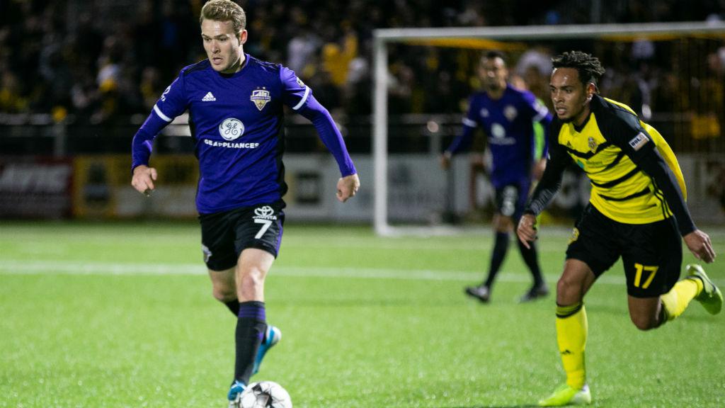 Louisville City FC midfielder Magnus Rasmussen runs with the ball in his side's 2-1 victory over No. 1 seed Pittsburgh Riverhounds SC in the Eastern Conference Semifinals. | Photo courtesy Chris Cowger / Pittsburgh Riverhounds SC