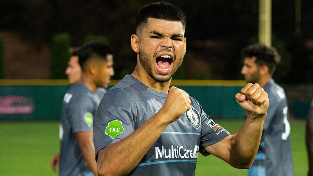 Tacoma Defiance's Azriel Gonzalez celebrates on Thursday night after recording a goal and assist in his side's 2-1 win against San Diego Loyal SC. | Photo courtesy Charis Wilson / Tacoma Defiance