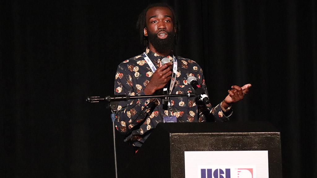 USL Black Players Alliance co-founder Hugh Roberts speaks at the 2021 USL Winter Summit. | Photo courtesy Clay Benjamin / United Soccer Leagues
