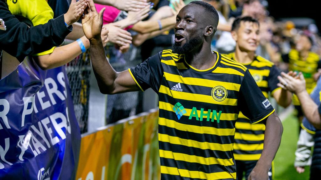 Pittsburgh Riverhounds SC forward Albert Dikwa is the 13th player to record a 20-goal regular season in the USL Championship's history. | Photo courtesy Chris Cowger / Pittsburgh Riverhounds SC