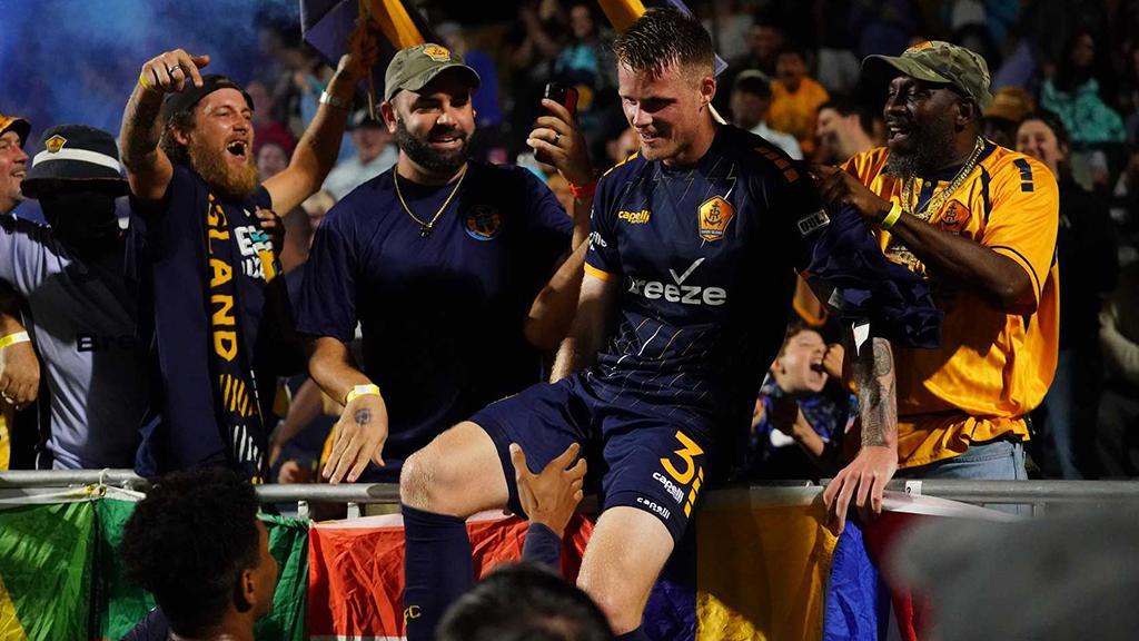 Rhode Island FC's Stephen Turnbull celebrates with fans after putting the side ahead against Birmingham Legion FC at Beirne Stadium. | Photo courtesy Merisa Boyd / Rhode Island FC