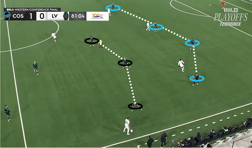 The Switchbacks’ defensive line (in blue) sits 10-15 yards ahead of their box, compressing space behind the midfield (in black).