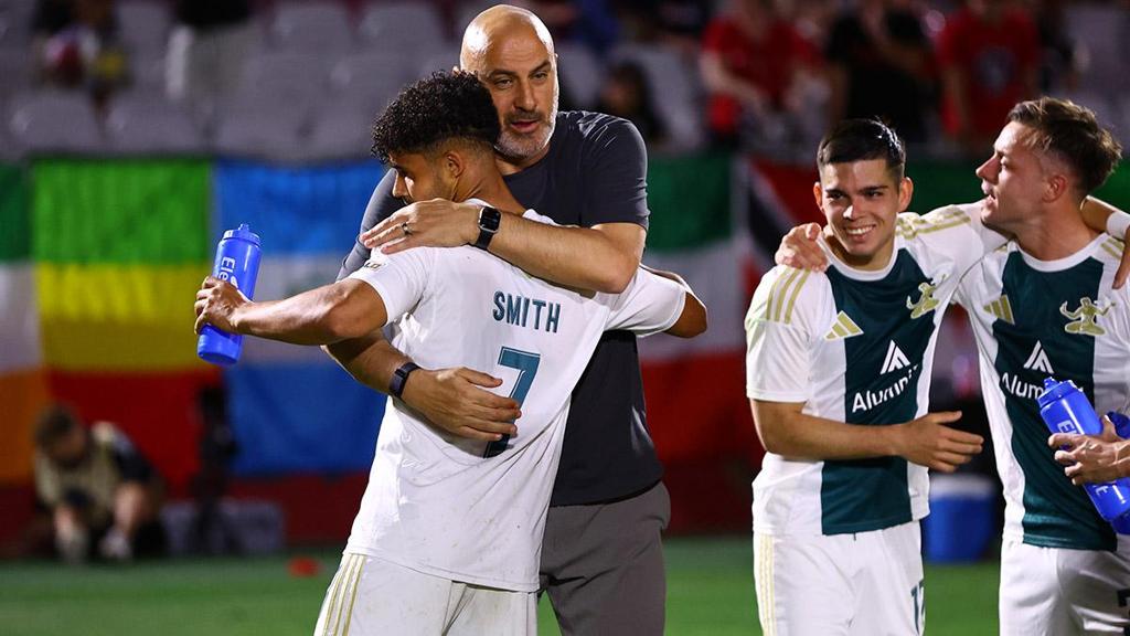 Detroit City FC Head Coach Danny Dichio hugs forward Darren Smith, whose two goals helped spark the club's dramatic 3-2 win against Phoenix Rising FC on Saturday night. | Photo courtesy Isabella Duran / Phoenix Rising FC