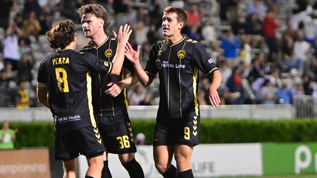 The Charleston Battery's MD Myers celebrates as his hat trick helped lead the side past South Georgia Tormenta FC in the Third Round of the U.S. Open Cup on Tuesday night. | Photo courtesy Michael Wiser / Charleston Battery