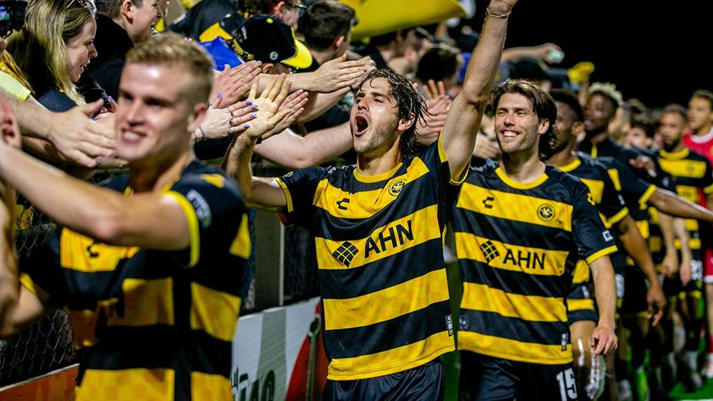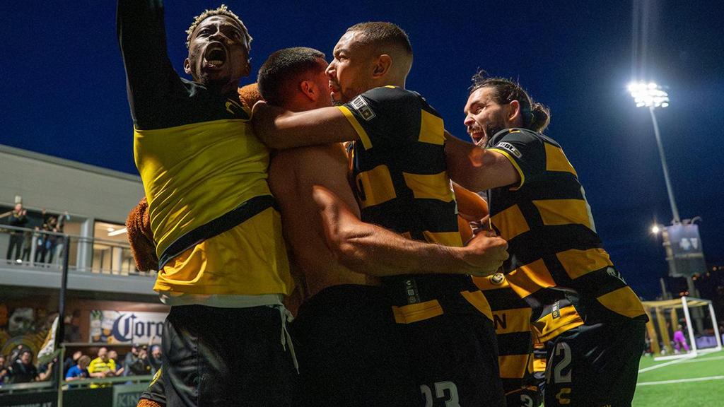 Pittsburgh Riverhounds SC celebrate Beto Ydrach's late winner against New York City FC in the Round of 32 of the 2025 Lamar Hunt U.S. Open Cup. | Photo courtesy Saif Greco / Pittsburgh Riverhounds SC