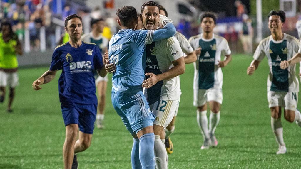 Detroit City FC's Michael Bryant and Carlos Herrera celebrate after claiming victory in a penalty shootout on Saturday night against Hartford Athletic, one of five games determined from the spot this weekend. | Photo courtesy Axel Zito / Hartford Athletic