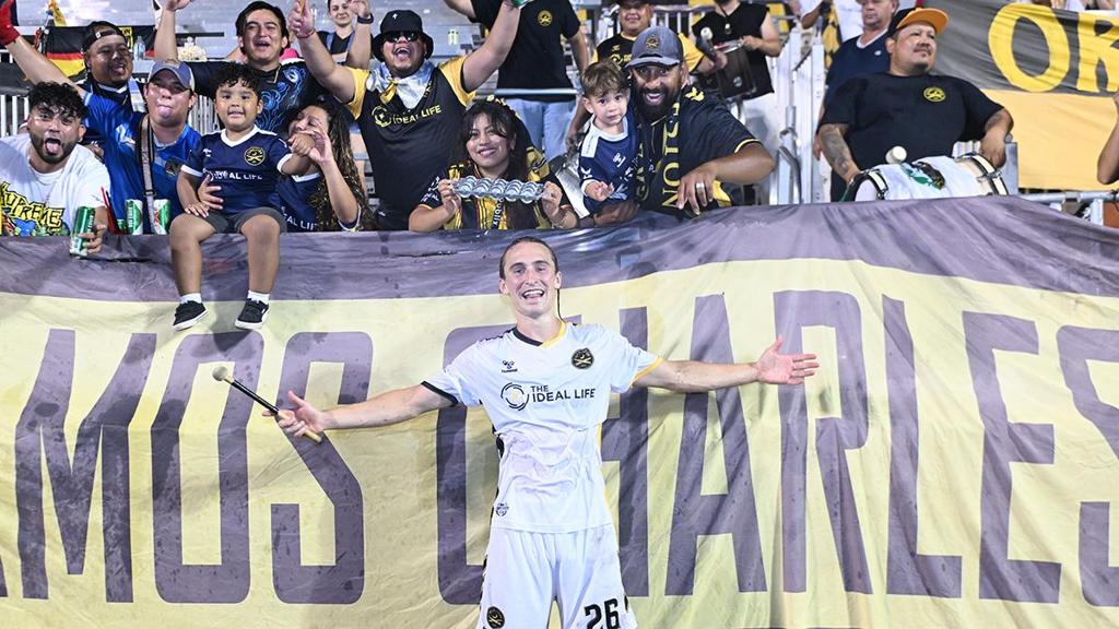 The Charleston Battery's Cal Jennings celebrates with fans after recording his 15th two-goal game in the USL Championship regular season, tying the league record. | Photo courtesy Michael Wiser / Charleston Battery