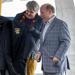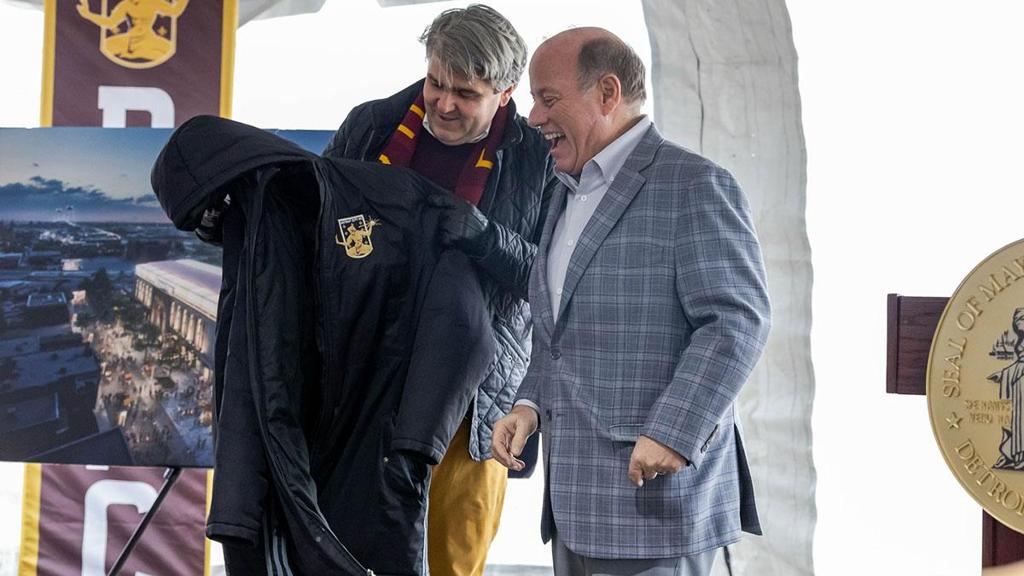 Detroit City FC CEO Sean Mann hands Detroit Mayor Mike Duggan a club jacket ahead of Friday's demolition ceremony. | Photo courtesy City of Detroit