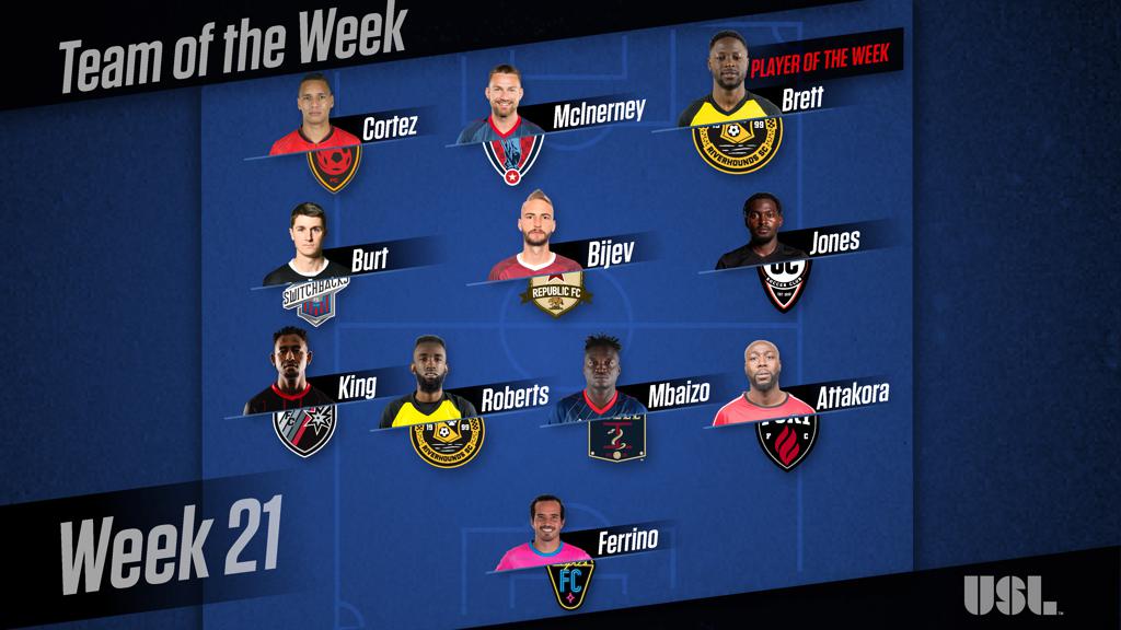 F – Neco Brett, Pittsburgh Riverhounds SC: Brett scored three goals over two games to lead the Hounds to a pair of victories and back into second place in the Eastern Conference.