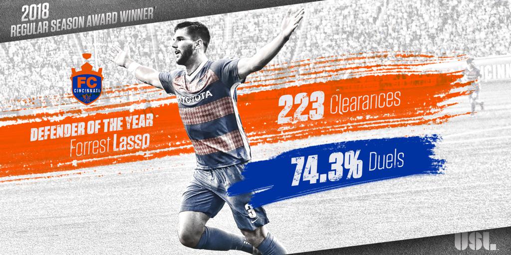 TAMPA, Fla. – The United Soccer League announced on Monday that FC Cincinnati center back Forrest Lasso has been voted the 2018 USL Defender of the Year. Named to the USL All-League First Team for the second consecutive season, Lasso was a key figure in an FC Cincinnati defense that helped the side claim the 2018 USL Regular Season Championship.